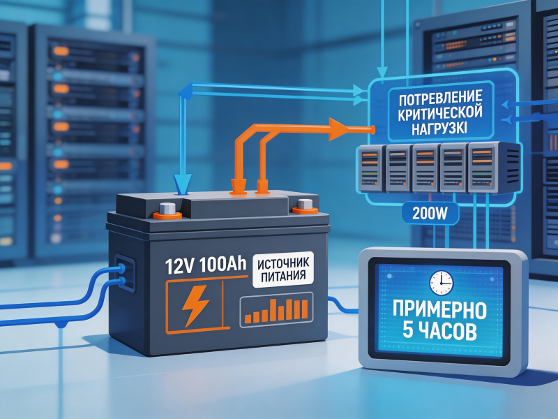 Для ИБП с батареей 12В 100А·ч: T = (12 × 100 × 0.9) / 500 ≈ 2.16 часа. Для более точного расчёта используйте наш онлайн-калькулятор.
